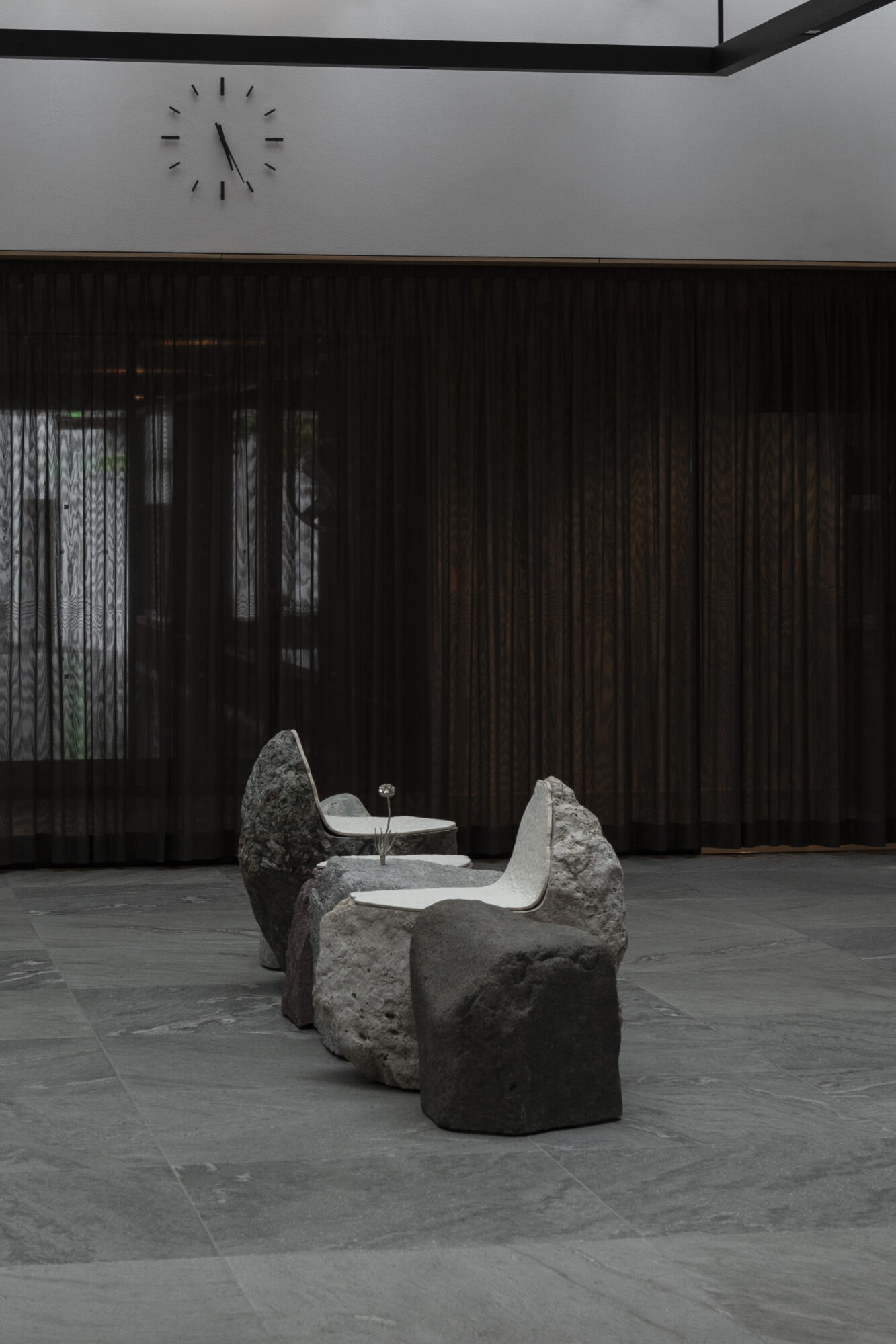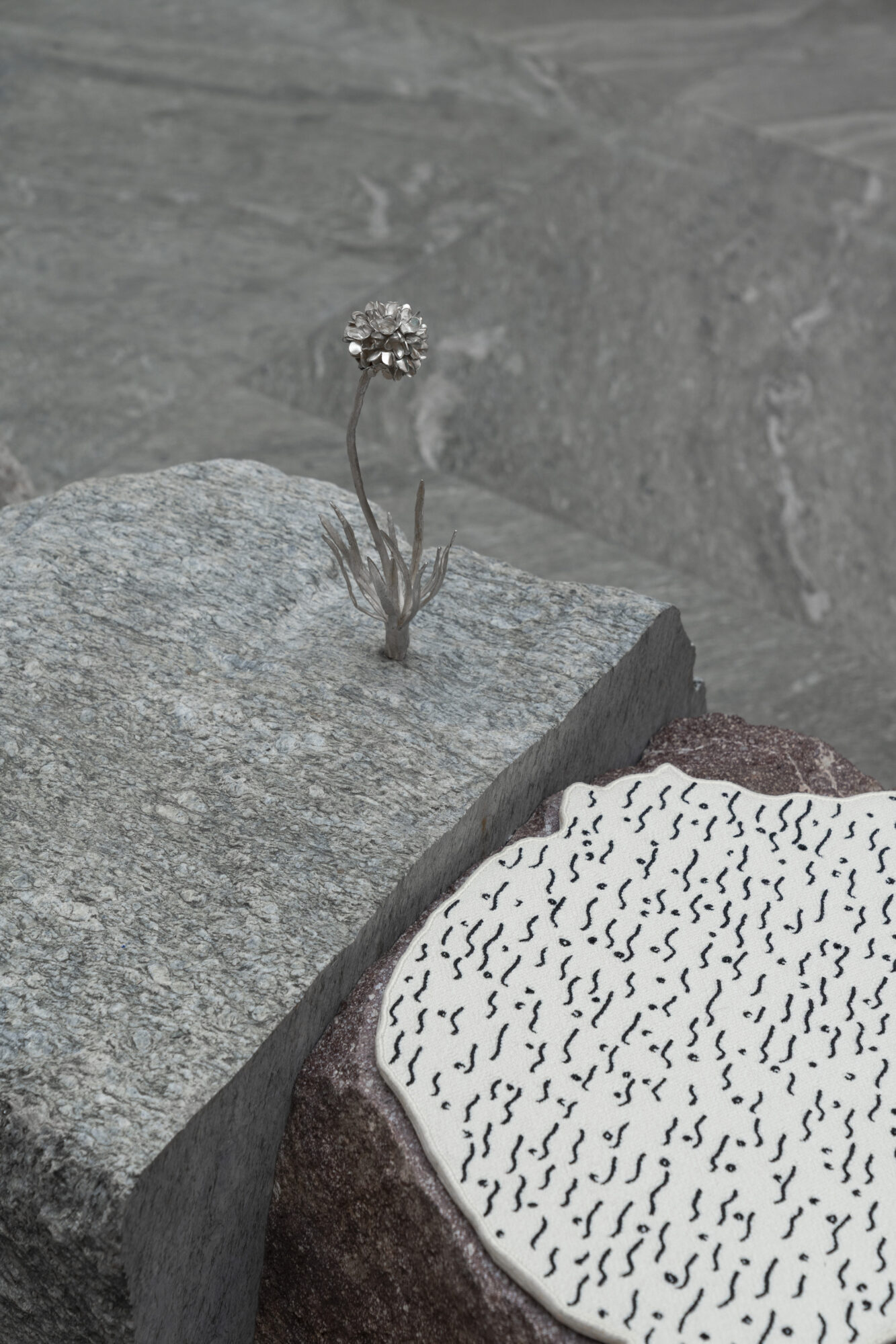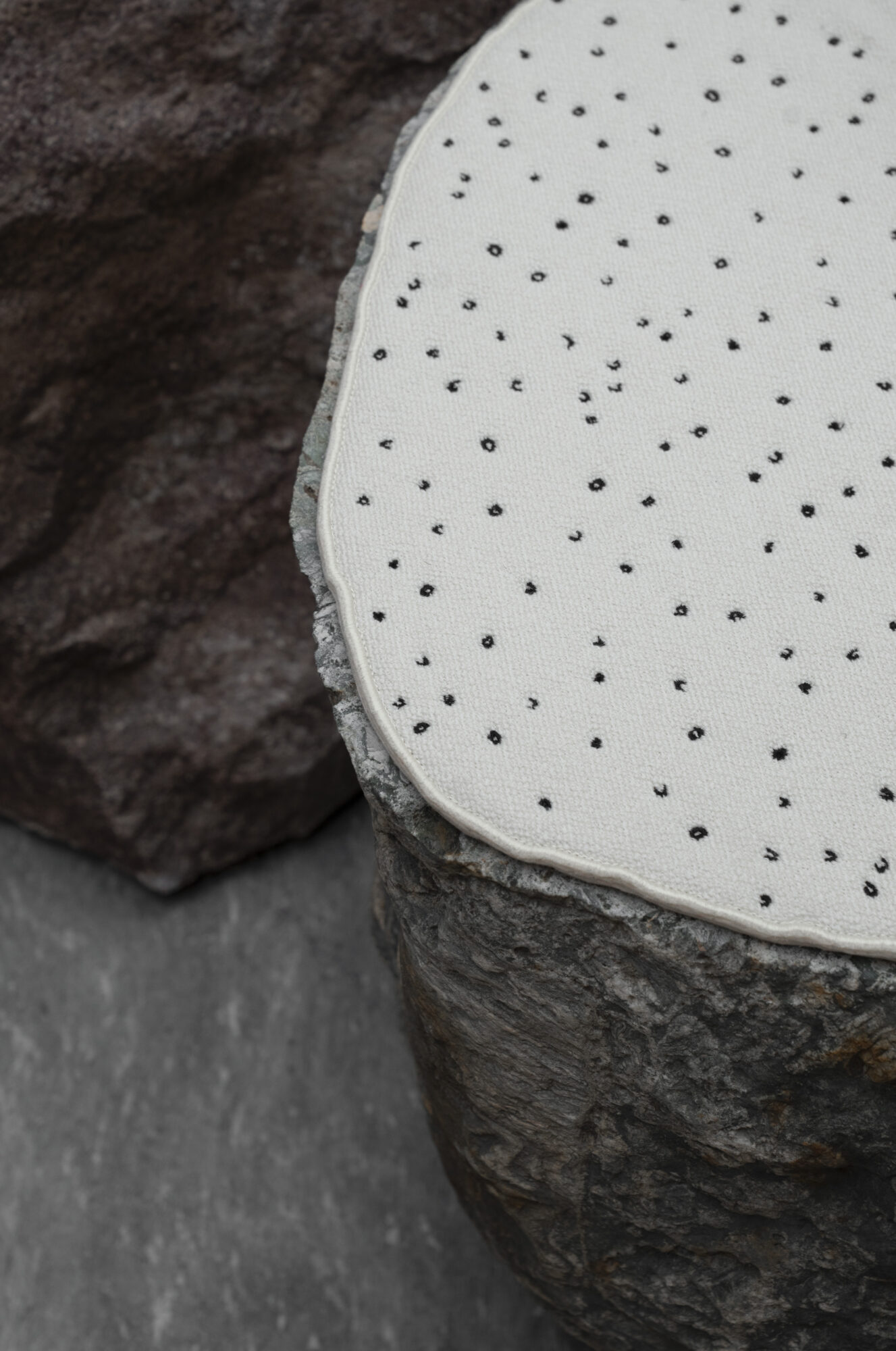 Take Away is seating installation, which consists of a bench made out of a folded galvanised sheet and three blankets. Each blanket has its basic form of a burrito, a wrap or a sushi roll and a printed instruction manual on it to explain how to fold and roll the particular snack. Participants are invited to be wrapped in the blankets and put on the bench waiting to be taken away.